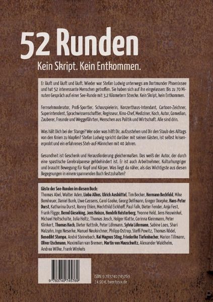 Er läuft und läuft und läuft. Wieder war Stefan Ludwig unterwegs am Dortmunder Phoenixsee und hat 52 interessante Menschen getroffen. Sie haben sich auf ihn eingelassen: Bis zu 70 Minuten Gespräch auf einer See-Runde mit 3,2 Kilometern Strecke. Kein Skript. Kein Entkommen.Fernsehmoderator, Profi-Sportler, Schauspielerin, Konzerthaus-Intendant, Cartoon-Zeichner, Superintendent, Sprachwissenschaftler, Regisseur, Kino-Chef, Mediziner, Koch, Autor, Comedian, Zauberer, Freunde und Weggefährten, Menschen aus Politik und Wirtschaft. Alle sind drin.Was hält Dich bei der Stange? Wer oder was hilft Dir, aufzustehen und Dir den Staub des Alltags von den Knien zu klopfen? Stefan Ludwig spricht darüber mit seinen Gästen, ist selbst krisenerprobt und ein erfahrenes Steh-auf-Männchen mit 40 Jahren.Gesundheit ist Geschenk und Herausforderung gleichermaßen. Das weiß der Autor, der durch eine spastische Cerebralparese gehbehindert ist. Er ist aber auch Arbeitnehmer, Kulturhungriger und braucht Bewegung für Kopf und Körper. Was liegt da näher, als das Wichtigste aus diesen Begegnungen in einem spannenden Buch festzuhalten?Gäste der See-Runden im zweiten Buch sind:Thomas Abel, Walter Aden, Lioba Albus, Ulrich Ausbüttel, Tim Becker, Hermann Beckfeld, Mike Bomheuer, Daniel Bunk, Uwe Cassens, Carol Cooke, Georg Delfmann, Gregor Doepke, Hans-Peter Durst, Katharina Durst, Ronny Ehlen, Mechthild Eickhoff, Paul Falk, Dieter Fender, Anja Fest, Frank Fligge, Bernd Gieseking, Jens Heinze, Hendrik Heisterberg, Yvonne Held, Jens Heuwinkel, Michael Holtschulte, Julia Holtz, Thomas Josch, Holger Klatte, Corinna Kleinmann, Peter Klinkert, Thomas Koch, Dieter Kottnik, Peter Löhmann, Sylvia Löhrmann, Sabine Loos, Shari Malzahn, Ingo Neserke, Manuel Neukirchner, Philipp Ostrop, Steffi Powitz, Thomas Rödel, Benedikt Stampa, André Steinebach, Kai Magnus Sting, Friederike Tiefenbacher, Marion Tillmann, Oliver Uschmann, Maximilian van Bremen, Martin von Mauschwitz, Alexander Waldhelm, Andrea Wilke, Frank Winkels
