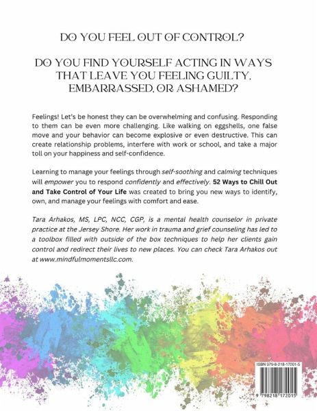 Are you fed up with feeling angry, worried, sad, tired, and anxious? What if you could feel happy and confident in a year? And all you had to do was spend a few minutes a week on developing skills to self-soothe and manage your thoughts and feelings. 52 Ways to Chill Out and Take Control of Your Life shares evidence-based techniques:Meditation Breath Work Cognitive Behavioral Therapy Techniques Mindfulness Techniques Emotional Regulation Skills Reduce stress, manage anxiety, and boost your mood! Let your author guide you through a year's worth of coping skills. That's 52 different techniques! You will learn about various self-care strategies that are easy to incorporate into your routine. This self-help workbook offers a variety of techniques to cater to your needs and preferences, like meditation to quiet your mind and find inner peace, breath work to feel energized, and CBT to challenge negative thoughts and behaviors. Mindfulness helps you stay present and grounded, so you can enjoy life to the fullest! After developing foundational skills, the workbook guides you through further self-development and self-improvement. Focusing on self-compassion and acceptance you will enhance your self-awareness and self-esteem leaving you happier and healthier.