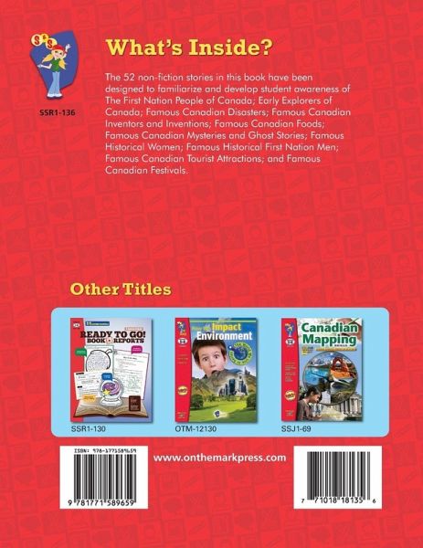 52 nonfiction stories in this book have been designed to familiarize and develop student awareness of Canada. Each section contains nonfiction stories and follow-ups designed to review, strengthen, and expand students' reading and language skills while familiarizing them with different aspects of Canada. A year of non-fiction reading in one book! One story a week for bell work, review, indoor recess, enrichment or for the students who are done their work early. Section 1 First Nations People of Canada Story #1: The Iroquois - People of the Longhouse Story #2: First Nations People of the Mackenzie and Yukon River Basins Story #3: Woodland First Nations - The Micmac Story #4: People of the Western Plains Story #5: People of the Plateau Story #6: Pacific Coast First Nations Section 2 Early Explorers of Canada Story #1: The Vikings Come to Canada Story #2: John Cabot (*1450-1499) Story #3: Jacques Cartier (1491-1557) Story #4: Samuel de Champlain - Founder of New France Story #5: Samuel de Champlain - Building the Habitation Story #6. Samuel de Champlain - The Enemies of New France Story #7: Champlain Explores Ontario Story #8: Etienne Brule (1591-1633) Story #9: Radisson and Groseilliers Story #10: Robert De La Salle (1640-1687) Story #11: Henry Hudson (1565-1611) Section 3 Famous Disasters Story #1: The R.M.S. Empress of Ireland Story #2: Swiss Air Flight Story #3: The 1910 Rogers Pass Avalanche Section 4 Famous Games and Sports Story #1: Crokinole, Trivial Pursuit, Rummoli Story #2: Basketball and Five-Pin Bowling Story #3: Lacrosse Section 5 Famous Inventors and Their Inventions Story #1: Snowblower, Snow Goggles, Spring Skates Story #2: The Inventors of Better Lighting Story #3: The Zipper, The Paint Roller and Garbage Bags Section 6 Famous Food Story #1: Peanut Butter, McIntosh Apple, Maple Syrup Story #2: Split Pea Soup, Tortiere, Poutine, Beavertails Story #3: Figgy duff, Saskatoon Berries, Butter Tarts, Nanaimo Bars Section 7 Famous Mysteries and Ghost Stories Story #1: The Mystery Pit of Oak Island Story #2: The Legend of the Screaming Tunnel Story #3: Big Jos Montferrand Story #4: The Ghosts of Canada Section 8 Famous Historical Women Story #1: Marie Jacquelin De La Tour (1602-1645) Story #2: Marie Anne Gaboury Story #3: Catherine O'Hare Schubert (1835-1918) Story #4: Susanna Moodie (1803-1885) Story #5: Doctor Emily Jennings Stowe (1831-1903) - Section 9 Famous Historical First Nations Leaders Story #1: Big Bear - Mistahimaska (1825- 1888) Story #2: Joseph Brant (1742-1807) Thayendanega Story #3: Crowfoot (1830-1890) Story #4: Poundmaker (1842-1886) Section 10 Famous Canadian Places Story #1: The Discovery Islands - Chain of 6 000 Islands Story #2: Butchart Gardens Story #3: Fortress of Louisburg Story #4: Cape Spear Lighthouse Story #5: Prince of Wales Fort Story #6: Bar U Ranch - An Active Historic Ranch Story #7: Sainte-Marie Among the Hurons Story #8: McCrae House Section 11 Famous Canadian Festivals Story #1: Winterlude Story #2: Caribana