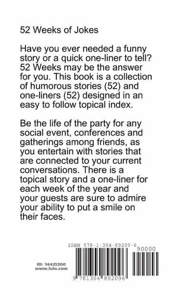 52 Weeks of Jokes Have you ever needed a funny story or a quick one-liner to tell? 52 Weeks may be the answer for you. This book is a collection of humorous stories (52) and one-liners (52) designed in an easy to follow topical index. Be the life of the party for any social event, conferences and gatherings among friends, as you entertain with stories that are connected to your current conversations. There is a topical story and a one-liner for each week of the year and your guests are sure to admire your ability to put a smile on their faces.