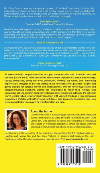 52 Weeks to Self-Love: Your Yearlong Journey to Confidence, Empowerment and Inner Peace Are you ready to unlock the power of Self-love and transform your life from the inside out? 52 Weeks to Self-Love by Dana A. Gionta, Ph.D., is a nurturing guide designed to help you cultivate self-acceptance, build unshakable confidence, and live the life You want. Perfect for women seeking empowerment, inspiration, and personal transformation, this book offers a roadmap to rediscover your worth, your dreams, your truth-one week at a time. Drawing from over 20 years of experience as a coach and therapist, Dr. Dana Gionta provides you with:52 weekly practices and journaling prompts to foster self-reflection, clarity and growth. Practical tools and strategies to break free from self-doubt, set healthy boundaries, and live more courageously. Insights into how societal influences and family dynamics shape your beliefs about love-and how to redefine them. Using the metaphor of a beautiful garden, this book reminds you that your personal growth is initially unseen. Just as roots deepen before vibrant blossoms emerge, your journey to self-love and transformation begins within. With kindness, patience, and nurturing practices, you'll blossom into the confident, empowered woman you're meant to be. What You'll Gain:A deeper connection with yourself and your inner wisdom. Strategies to overcome limiting beliefs and negative self-talk. The courage to celebrate your unique qualities and Self unapologetically. Confidence to navigate life's challenges with grace and resilience. Whether you read a chapter in the mornings, during quiet evening moments, or whenever you need to feel uplifted, this book will support you every step of the way. And to support you even further, this book includes access to exclusive bonus resources, thoughtfully designed to deepen your self-love journey: A favorite reflection to help you start nurturing your relationship with yourself right away. A full chapter on setting healthy boundaries, offering practical tools and strategies for navigating relationships with confidence. An inspirational quote sheet, perfect for keeping motivation and self-compassion at the forefront of your day. These resources provide valuable tools to help you turn insights into action and foster lasting change. Begin This Beautiful Journey Today! Imagine the transformation you'll feel in 52 weeks-radiating confidence, living authentically, and Loving the incredible woman you are. The first step is just a page away. Read 52 Weeks to Self-Love now and access your FREE bonus resources to enhance your journey along the way!