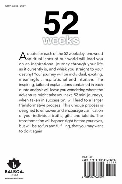 A quote for each of the 52 weeks by renowned spiritual icons of our world will lead you on an inspirational journey through your life as it currently is, and whisk you straight to your destiny! Your journey will be individual, exciting, meaningful, inspirational and intuitive. The inspiring, tailored explanations contained in each quote analysis will leave you wondering where the adventure might take you next. 52 mini journeys, when taken in succession, will lead to a larger transformative process. This unique process is designed to empower and encourage clarification of your individual truths, gifts and talents. The transformation will happen right before your eyes, but will be so fun and fulfilling, that you may want to do it again!