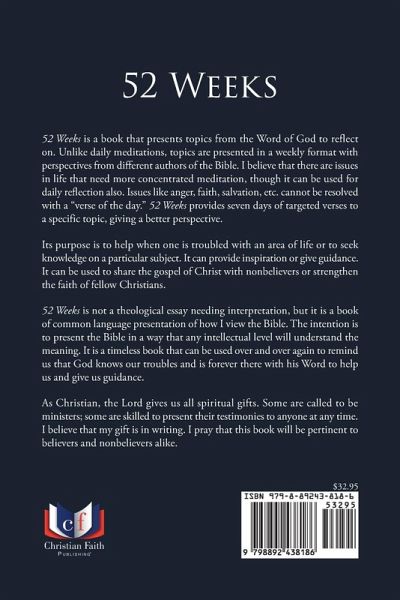 52 Weeks is a book that presents topics from the Word of God to reflect on. Unlike daily meditations, topics are presented in a weekly format with perspectives from different authors of the Bible. I believe that there are issues in life that need more concentrated meditation, though it can be used for daily reflection also. Issues like anger, faith, salvation, etc. cannot be resolved with a "verse of the day." 52 Weeks provides seven days of targeted verses to a specific topic, giving a better perspective. Its purpose is to help when one is troubled with an area of life or to seek knowledge on a particular subject. It can provide inspiration or give guidance. It can be used to share the gospel of Christ with nonbelievers or strengthen the faith of fellow Christians. 52 Weeks is not a theological essay needing interpretation, but it is a book of common language presentation of how I view the Bible. The intention is to present the Bible in a way that any intellectual level will understand the meaning. It is a timeless book that can be used over and over again to remind us that God knows our troubles and is forever there with his Word to help us and give us guidance. As Christian, the Lord gives us all spiritual gifts. Some are called to be ministers; some are skilled to present their testimonies to anyone at any time. I believe that my gift is in writing. I pray that this book will be pertinent to believers and nonbelievers alike.