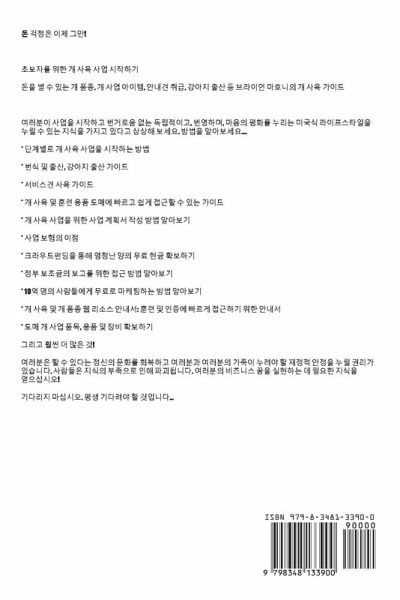 돈 걱정은 이제 그만! 초보자를 위한 개 사육 사업 시작하기 돈을 벌 수 있는 개 품종, 개 사업 아이템, 안내견 취급, 강아지 출산 등 브라이언 마호니의 개 사육 가이드 여러분이 사업을 시작하고 번거로움 없는 독립적이고, 번영하며, 마음의 평화를 누리는 미국식 라이프스타일을 누릴 수 있는 지식을 가지고 있다고 상상해 보세요. 방법을 알아보세요.... * 단계별로 개 사육 사업을 시작하는 방법 * 번식 및 출산, 강아지 출산 가이드 * 서비스견 사육 가이드 * 개 사육 및 훈련 용품 도매에 빠르고 쉽게 접근할 수 있는 가이드 * 개 사육 사업을 위한 사업 계획서 작성 방법 알아보기 * 사업 보험의 이점 * 크라우드펀딩을 통해 엄청난 양의 무료 현금 확보하기 * 정부 보조금의 보고를 위한 접근 방법 알아보기 * 10억 명의 사람들에게 무료로 마케팅하는 방법 알아보기 * 개 사육 및 개 품종 웹 리소스 안내서 훈련 및 인증에 빠르게 접근하기 위한 안내서 * 도매 개 사업 품목, 용품 및 장비 확보하기 그리고 훨씬 더 많은 것! 여러분은 할 수 있다는 정신의 문화를 회복하고 여러분과 여러분의 가족이 누려야 할 재정적 안정을 누릴 권리가 있습니다. 사람들은 지식의 부족으로 인해 파괴됩니다. 여러분의 비즈니스 꿈을 실현하는 데 필요한 지식을 얻으십시오! 기다리지 마십시오. 평생 기다려야 할 것입니다...