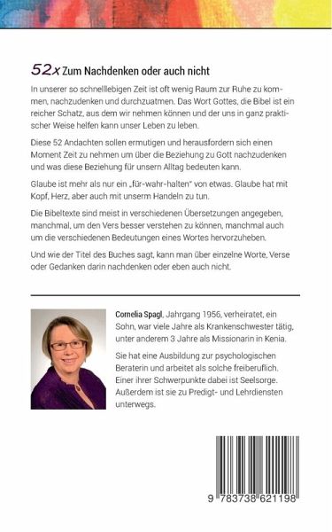 In unserer so schnelllebigen Zeit ist oft wenig Raum, zur Ruhe zu kommen, nachzudenken und durchzuatmen. Das Wort Gottes - die Bibel - ist ein reicher Schatz, aus dem wir nehmen können und der uns in ganz praktischer Weise helfen kann, unser Leben zu leben.Diese 52 Andachten sollen ermutigen und herausfordern, sich einen Moment Zeit zu nehmen, um über die Beziehung zu Gott nachzudenken und was diese Beziehung für unsern Alltag bedeuten kann.Glaube ist mehr als nur ein "für-wahr-halten" von etwas. Glaube hat mit Kopf, Herz, aber auch mit unserm Handeln zu tun.Die Bibeltexte sind meist in verschiedenen Übersetzungen angegeben, manchmal, um den Vers besser verstehen zu können, manchmal auch, um die verschiedenen Bedeutungen eines Wortes hervorzuheben.Und wie der Titel des Buches sagt, kann man über einzelne Worte, Verse oder Gedanken darin nachdenken, oder eben auch nicht.