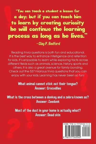 Disguise learning time as fun family bonding time. Studies have found that when kids associate learning with a strong positive emotion, they're more likely to retain information. What if you could give them this without piling on extra homework or trying to make fractions more interesting? Learning should be fun. And when it's done right, children shouldn't even be aware that it's happening. In times of need, fun trivia games are your secret weapon... and as an added bonus, you'll even boost your chances of winning future pub quizzes! Asking and answering trivia questions has been shown to not only enhance children's intelligence, but also their memory. And when this is incorporated into your family's quality bonding time, it creates the ultimate activity sure to tick off any parent's boxes. In 537 Hilarious Trivia Questions for Kids: Questions and Answer Book for Kids, you'll find hours of fun and knowledge. You'll discover:A guaranteed way to capture even the most reluctant learner's attention 537 fun and engaging questions to challenge the whole family Easy-to-find answers so no one is left in the dark A foolproof way to keep the little ones occupied during long car rides Unusual facts that your kids will be dying to find the answers to--and even learn from in the process A rich mixture of pop culture, sports trivia, and general knowledge questions Questions that allow the adults to learn just as much as the children A refreshing alternative to dry workbooks and school quizzes And much more. It can be hard to justify quality family time when you're worrying about making sure your kids are prioritizing their education--but you don't have to choose. Research shows that learning is most successful when it's fun. Is there any better excuse to put down the homework and start playing together?If you want to boost your child's knowledge without them whining in boredom, then click "Add to Cart" right now.