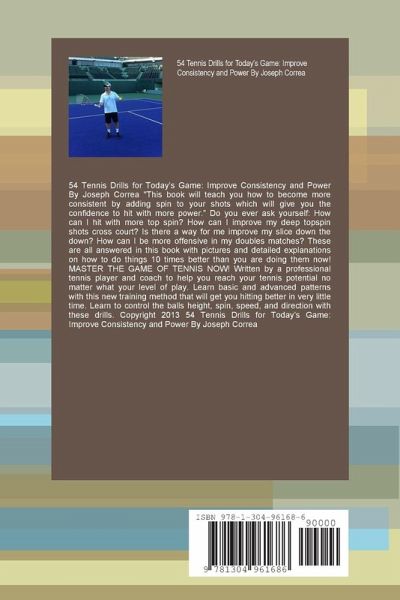54 Tennis Drills for Today's Game: Improve Consistency and Power By Joseph Correa "This book will teach you how to become more consistent by adding spin to your shots which will give you the confidence to hit with more power." Do you ever ask yourself: How can I hit with more top spin? How can I improve my deep topspin shots cross court? Is there a way for me improve my slice down the down? How can I be more offensive in my doubles matches? These are all answered in this book with pictures and detailed explanations on how to do things 10 times better than you are doing them now! MASTER THE GAME OF TENNIS NOW! Written by a professional tennis player and coach to help you reach your tennis potential no matter what your level of play. Learn basic and advanced patterns with this new training method that will get you hitting better in very little time.