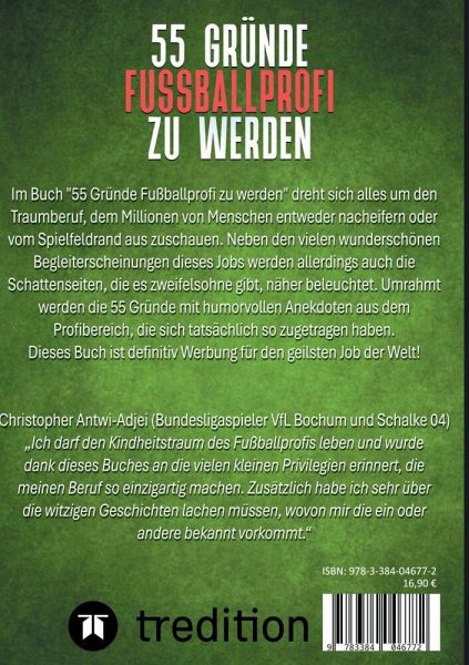 Im Buch "55 Gründe Fußballprofi zu werden" dreht sich alles um den Traumberuf des Fußballprofis. Neben vielen wunderschönen Begleiterscheinungen, die dieser Job mit sich bringt, werden allerdings auch die Schattenseiten näher beleuchtet. Umrahmt werden die 55 Gründe, diesen Beruf für sich auszuwählen, mit lustigen Anekdoten aus dem Profibereich, die sich wirklich so zugetragen haben. Dieses Buch ist definitiv Werbung für den besten Job der Welt!