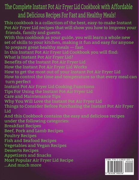 The Complete Instant Pot Air Fryer Lid Cookbook with Affordable and Delicious Recipes For Fast and Healthy Meals! This cookbook is a collection of the best, easy-to-make Instant Pot Air Fryer Lid recipes that will show you how to impress your friends, family and guests. With this cookbook as your guide, you will learn a whole new set of skills to your kitchen, making it fun and easy for anyone to prepare great healthy meals - fast. In this Instant Pot Air Fryer Lid Cookbook you will find:What is Instant Pot Air Fryer Lid? Benefits of the Instant Pot Air Fryer Lid How the Instant Pot Air Fryer Lid Works How to get the most out of your Instant Pot Air Fryer Lid How to control the time and temperature so that every meal can turn perfect Instant Pot Air Fryer Lid Cooking Functions Tips For Using the Instant Pot Air Fryer Lid Care and Maintenance Tips Why You Will Love the Instant Pot Air Fryer Lid Things to Consider Before Purchasing the Instant Pot Air Fryer Lid And this Cookbook contains the easy and delicious recipes under the following categories:Breakfast Recipes Beef, Pork and Lamb Recipes Poultry Recipes Fish and Seafood Recipes Vegetables and Vegan Recipes Desserts Recipes Appetizers and Snacks Most Popular Air Fryer Lid Recipe ...And much more ... What are you waiting for? Scroll to the top of the page and click the "BUY NOW" button to start immediately!