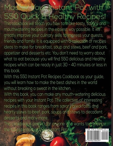 Master Your Instant Pot with 550 Quick and Healthy Recipes! This cookbook will teach you how to make tasty, savory and mouthwatering recipes in the easiest way possible. It will greatly improve your culinary skills to impress your guests, friends and family. It is equipped with a collection of recipes ideas to make for breakfast, soup and stews, beef and pork, appetizer and desserts etc. You don't need to worry about what to eat because you will find 550 delicious and Healthy recipes which can be ready in just 30 - 40 minutes or less in this book. With this 550 Instant Pot Recipes Cookbook as your guide, you will learn how to make the best dishes in the world without breaking a sweat in the kitchen. With this book, you can make any mouth-watering delicious recipes with your Instant Pot. The collection of interesting recipes in this book ranges from savory breakfasts and hearty stews to beef, pork, soups and stews to decadent desserts and many more. This cookbook is perfect for anyone who wants to maximize the full potentials of their Instant Pot. In this book, you will find: 1. 550 Quick, Healthy and Mouthwatering Recipes for your Instant Pot. 2. It contains Instant Pot tips and tricks for complete beginners. 3. Big variety of modern recipes for any taste to surprise your family and friends. 4. Everything can be served in less than few minutes and yet delicious. 5. Common and Tasty Ingredients for no-fuss meals. 6. Easy-to-follow Instructions written in clear and understandable manner. The 550 Instant Pot Recipes Cookbook will take care of your scarce cooking time and will show you the easiest & tastiest way towards a whole new life with your Instant Pot! To get this book, Scroll Up Now and Click on the "Buy now with 1-Click" Button to Download your Copy Right Away! Grab Your Copy Now!