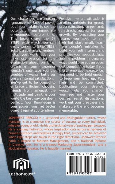 Our challenges are neither ignorance nor lack of power, but in our inability to see the potentials in our immediate environment before time. This book x-rays the 57 STEPS with which you can easily work into GREATNESS. Setting a goal in any venture, helps you work out your innermost passion for the evaluation ahead on time; organising your expenses wouldn't only save you the troubles of wants, but gives you an internal satisfaction. You've got to be dogged to embrace criticism, choosing friends from amongst the multitude and painting your world the best way you deem perfect. Your Knowledge is your power; you had better guard it against adulterations. Positive mental attitude is another antidote for greed, procrastination, anger and; it attracts success for your growth. By forecasting your future, you need to aim high but start small; learn from people's mistakes to build your self-interest and prioritise your needs skilfully. Solving problem in dynamic ways would give you an edge; quit complaining today if you must embrace excellence, you need to be bold enough to keep your head up, Play high and be committed. Duplicating your strength would help you sharpen your ego and master your desires; resist distractions, work out your greatness and make sure the end becomes memorable.