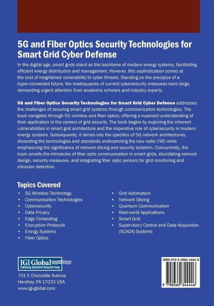 In the digital age, smart grids stand as the backbone of modern energy systems, facilitating efficient energy distribution and management. However, this sophistication comes at the cost of heightened vulnerability to cyber threats. Standing on the precipice of a hyper-connected future, the inadequacies of current cybersecurity measures loom large, demanding urgent attention from academic scholars and industry experts. 5G and Fiber Optics Security Technologies for Smart Grid Cyber Defense addresses the challenges of securing smart grid systems through communication technologies. The book navigates through 5G wireless and fiber optics, offering a nuanced understanding of their application in the context of grid security. The book begins by exploring the inherent vulnerabilities in smart grid architecture and the imperative role of cybersecurity in modern energy systems. Subsequently, it delves into the specifics of 5G network architectures, dissecting the technologies and standards underpinning the new radio (NR) while emphasizing the significance of network slicing and security isolation. Concurrently, the book unveils the intricacies of fiber optic communication in smart grids, elucidating network design, security measures, and integrating fiber optic sensors for grid monitoring and intrusion detection.