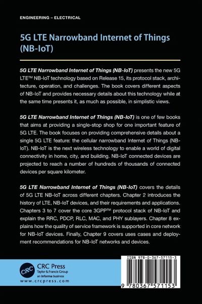 This book explains the 3GPP technical specifications for the upcoming 5G Internet of Things (IoT) technology based on latest release which is Release 15. It details the LTE protocol stack of an IoT device, architecture and framework, how they are functioning and communicate with cellular infrastructure, and supported features and capability. NB-IoT is designed to connect a large number of devices in a wide range of application domains forming so-called Internet of Things (IoT). Connected devices are to communicate through cellular infrastructure. This technology is new within the 3GPP specifications and is part of upcoming new wireless technology known as 5G. Table of Contents Preface. Acknowledgments. Author. List of Abbreviations. 1. Internet of Things. 2. 4G and 5G Systems. 3. Radio Resource Control Sublayer. 4. Packet Data Convergence Protocol Sublayer. 5. Radio Link Control Sublayer. 6. Medium Access Control Sublayer. 7. Physical Sublayer. 8. Quality of Service Architecture. 9. Use Cases and Deployment. References. Index.