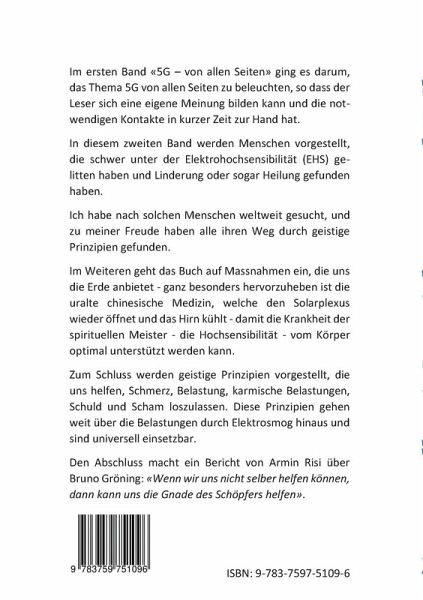 Im ersten Band "5G - von allen Seiten" ging es darum, das Thema 5G von allen Seiten zu beleuchten, so dass der Leser sich eine eigene Meinung bilden kann und die notwendigen Kontakte in kurzer Zeit zur Hand hat. In diesem zweiten Band werden Menschen vorgestellt, die schwer unter der Elektrohochsensibilität (EHS) gelitten haben und Linderung oder sogar Heilung gefunden haben. Ich habe nach solchen Menschen weltweit gesucht, und zu meiner Freude haben alle ihren Weg durch geistige Prinzipien gefunden.Im Weiteren geht das Buch auf Massnahmen ein, die uns die Erde anbietet - ganz besonders hervorzuheben ist die uralte chinesische Medizin, welche den Solarplexus wieder öffnet und das Hirn kühlt - damit die Krankheit der spirituellen Meister - die Hochsensibilität - vom Körper optimal unterstützt werden kann. Das Buch wird ergänzt durch geistige Prinzipien, die uns helfen, Schmerz, Belastung, karmische Belastungen, Schuld und Scham loszulassen. Diese Prinzipien gehen weit über die Belastungen durch Elektrosmog hinaus und sind universell einsetzbar.Den Abschluss macht ein Bericht von Armin Risi über Bruno Gröning: "Wenn wir uns nicht selber helfen können, dann kann uns die Gnade des Schöpfers helfen".