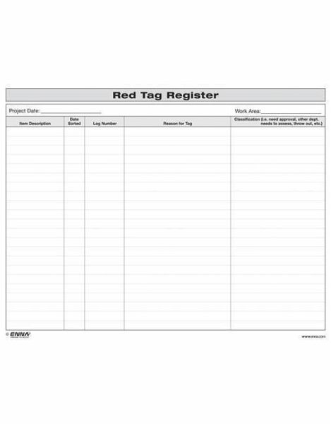 The 5S Red Tag Register is an effective form used to log all items that have been identified and tagged in an areaâ (TM)s 5S Red Tagging event. This form logs each 5S red tagged item, the itemâ (TM)s classification, and the course of action to be taken so it can be tracked. Using the 5S Red Tag Register form provides a single point of control and reference for your tracking movement of equipment and materials during a workshop.