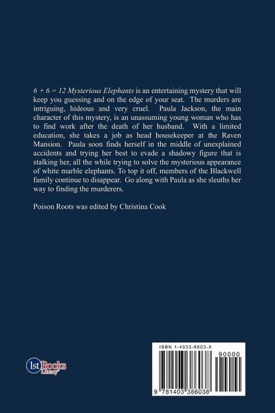 6 + 6=12 Mysterious Elephants is a mystery of perplexing situations. This mystery begins with the death of Paula's husband which leads her to a job with hideous murders, deadly accidents, missing family members, a stalking shadowy figure, and mysteriously appearing marble elephants.