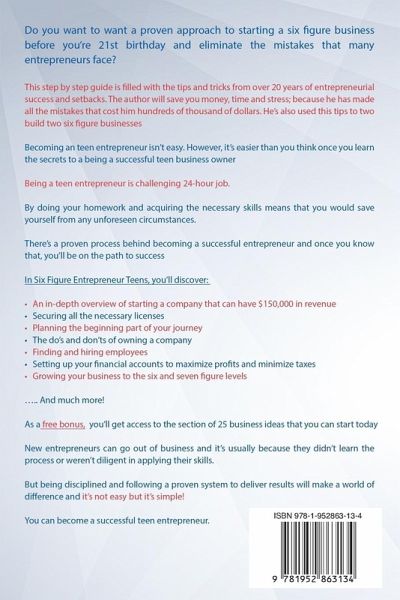 Do you want to learn the secrets of starting a small business? Do you want to be an entrepreneur, be financially independent and secure a bright future for your family? If you answered "yes" to any of these questions, keep reading ..... You are already on your way! The fact that you're reading this means you've decided to change your life for the better. And either you've realized or will soon realize that you need to follow a structured plan to achieve success However, your life's situation demands that you act in a hurry and be on your way as soon as you can. Don't panic, it's not too late. This groundbreaking book summarizes two decades of entrepreneurial experience that has helped the author make hundreds of thousands of dollars More importantly, this book will give you the keys to minimize the mistakes that cause businesses and entrepreneur's to fail. That's because the author has made all the mistakes for you. Being a entrepreneur is challenging, which means it's a 24-hour job. By doing your homework and acquiring the necessary skills means that you would save yourself from any unforeseen circumstances There's a proven process behind becoming a successful entrepreneur and once you know that. In the 6 Figure Entrepreneur, you'll discover Getting an in-depth overview of the basics of starting a company Securing all the necessary licenses Planning the beginning part of your journey The do's and don'ts of building a business The importance of having a bookkeeper and/or accountant And much more! As a free bonus ; you'll get access to the chapter of surviving your first year in the business and establishing yourself as a competent and trusted player New entrepreneurs can go out of business and it's usually because they didn't learn the process or weren't diligent in applying their skills But being disciplined and following a proven system to deliver results will make a world of difference and it's so simple to follow that even a caveman could do it. And even if you've never been in business by yourself, you can become a successful entrepreneur So, if you want to avoid failing as a business owner buy this book!