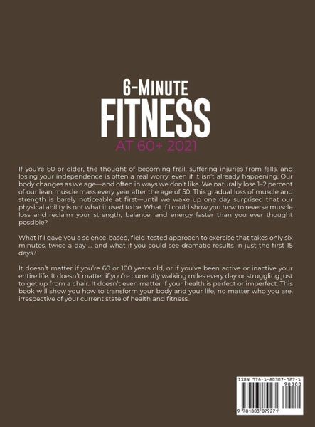 If you're 60 or older, the thought of becoming frail, suffering injuries from falls, and losing your independence is often a real worry, even if it isn't already happening. Our body changes as we age-and often in ways we don't like. We naturally lose 1-2 percent of our lean muscle mass every year after the age of 50. This gradual loss of muscle and strength is barely noticeable at first-until we wake up one day surprised that our physical ability is not what it used to be. What if I could show you how to reverse muscle loss and reclaim your strength, balance, and energy faster than you ever thought possible? What if I gave you a science-based, field-tested approach to exercise that takes only six minutes, twice a day ... and what if you could see dramatic results in just the first 15 days? It doesn't matter if you're 60 or 100 years old, or if you've been active or inactive your entire life. It doesn't matter if you're currently walking miles every day or struggling just to get up from a chair. It doesn't even matter if your health is perfect or imperfect. This book will show you how to transform your body and your life, no matter who you are, irrespective of your current state of health and fitness.