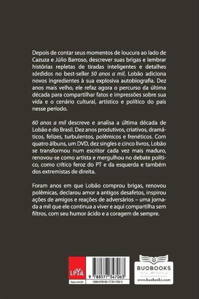 Lobão escreve a segunda parte de sua autobiografia, narrando todos os detalhes de seu intenso percurso na última década ¿ período em que produziu muito, renovou polêmicas, inspirou ações e provocou reações No fim de 2010, o cantor, compositor e multi-instrumentista Lobão publicava sua explosiva autobiografia, o best-seller 50 anos a mil. Agora, dez anos depois, ele brinda os leitores com a segunda parte (e igualmente explosiva) de sua história, incluindo as novas brigas em que se envolveu, suas criações artísticas mais recentes e as turbulências pelas quais o Brasil passou na última década. Com 60 anos a mil, Lobão se afirma como um ¿autor rock'n'roll¿, nos entregando, nesta quinta obra, uma narrativa intensa e corajosa. Muito pode ser dito sobre ele, mas ele jamais poderá ser acusado de omissão: neste inédito, Lobão se dedica, inclusive, a dividir com o público razões e decepções de suas escolhas, convicções e revisões. Polêmicas e polêmicas, mas, como na capa, desde 50 anos a mil, Lobão sempre se apresenta de frente ¿ dando a cara a tapa.
