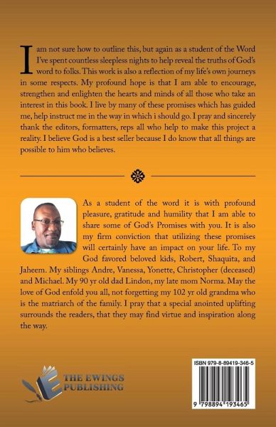 I am not sure how to outline this, but again as a student of the Word I've spent countless sleepless nights to help reveal the truths of God's word to folks. This work is also a reflection of my life's own journeys in some respects. My profound hope is that I am able to encourage, strengthen and enlighten the hearts and minds of all those who take an interest in this book. I live by many of these promises which has guided me, help instruct me in the way in which i should go. I pray and sincerely thank the editors, formatters, reps all who help to make this project a reality. I believe God is a best seller because I do know that all things are possible to him who believes.