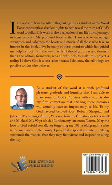 I am not sure how to outline this, but again as a student of the Word I've spent countless sleepless nights to help reveal the truths of God's word to folks. This work is also a reflection of my life's own journeys in some respects. My profound hope is that I am able to encourage, strengthen and enlighten the hearts and minds of all those who take an interest in this book. I live by many of these promises which has guided me, help instruct me in the way in which i should go. I pray and sincerely thank the editors, formatters, reps all who help to make this project a reality. I believe God is a best seller because I do know that all things are possible to him who believes.