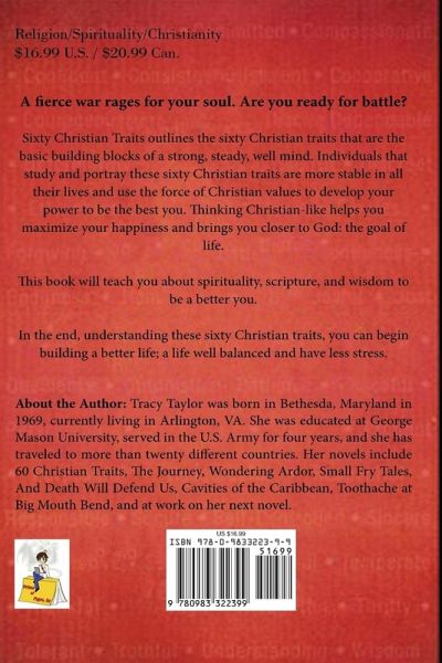 A fierce war rages for your soul. Are you ready for battle? Sixty Christian Traits outlines the sixty Christian traits that are the basic building blocks of a strong, steady, well mind. Individuals who study and portray these sixty Christian traits are more stable in their lives and use the force of Christian values to develop their power to be the best you. Thinking Christian-like helps you maximize your happiness and brings you closer to God: the goal of life. This book will teach you about spirituality, scripture, and wisdom to be a better you. In the end, understanding these sixty Christian traits, you can begin building a better life; a life well balanced and have less stress.