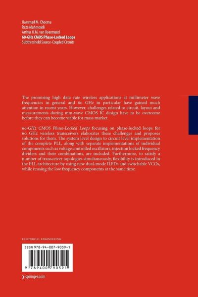 Abstract This chapter lays the foundation for the work presented in latter chapters. The potential of 60 GHz frequency bands for high data rate wireless transfer is discussed and promising applications are enlisted. Furthermore, the challenges related to 60 GHz IC design are presented and the chapter concludes with an outline of the book. Keywords Wireless communication 60 GHz Millimeter wave integrated circuit design Phase-locked loop CMOS Communication technology has revolutionized our way of living over the last century. Since Marconi's transatlantic wireless experiment in 1901, there has been tremendous growth in wireless communication evolving from spark-gap telegraphy to today's mobile phones equipped with Internet access and multimedia capabilities. The omnipresence of wireless communication can be observed in widespread use of cellular telephony, short-range communication through wireless local area networks and personal area networks, wireless sensors and many others. The frequency spectrum from 1 to 6 GHz accommodates the vast majority of current wireless standards and applications. Coupled with the availability of low cost radio frequency (RF) components and mature integrated circuit (IC) techn- ogies, rapid expansion and implementation of these systems is witnessed. The downside of this expansion is the resulting scarcity of available bandwidth and allowable transmit powers. In addition, stringent limitations on spectrum and energy emissions have been enforced by regulatory bodies to avoid interference between different wireless systems.