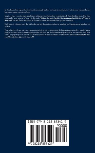 In the silence of the night, when the heart beats strongly and the soul seeks its complement, words become verses and verses become the purest expression of love. Imagine a place where the deepest and purest feelings are transformed into words that touch the soul and the heart. That place exists, and it is the universe of poetry. In this book, "60 Love Poems in English: The Most Beautiful Collection of Poems in the World," you will find a compilation of the most beautiful and emotional love poems ever written. Each poem is a literary jewel that will make you feel the passion, tenderness, nostalgia, and happiness that only love can awaken. This collection will take you on a journey through the centuries, discovering the beauty of poetry in all its manifestations. Here you will find verses that will inspire you, that will move you, and that will make you dream of true love. Get ready to be carried away by the passion of words and immerse yourself in the most sublime world of poetry. This is undoubtedly the most beautiful collection of poems in the world.