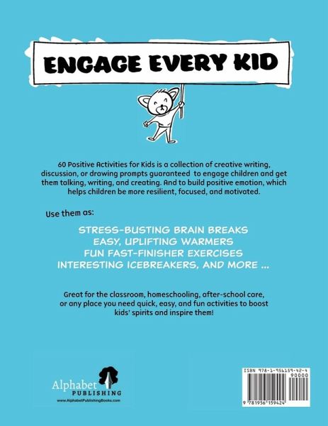 How can we help kids enjoy learning more? This book sets out to do just that with 60 positive activities, each page a hand-drawn illustration and a prompt for writing, discussion, drawing or all of the above. Students will love the open-ended questions, the fun drawings, and the opportunity to draw, color, write, or sketch. Yet these positive classroom activities have a serious purpose: building resilience, grit, and mindfulness. When kids get caught in a negative cycle of frustration and anxiety, they don't learn or retain information as well! The prompts in this book are designed to help free students from this negativity, build self-understanding, create compassion, and help them love to learn. Students will be: telling jokes remembering happy memories creating new holidays writing thank you notes and more... Highly adaptable and flexible, these exercises are make great stress-busters, brain-breaks, warmers, fillers, or fast-finisher activities. Easy to fit into a primary-school classroom, after-school program, preschool, nursery school, kindergarten, or even homeschooling situation.