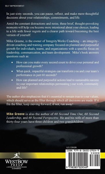 In just sixty seconds, you can pause, reflect, and make more thoughtful decisions about your relationships, commitments, and life. Amid the constant distractions and noise, these brief, thought-provoking moments will help you become more intentional about your choices, leading to a life with fewer regrets and a clearer path toward becoming the best version of yourself. Mike Greene, is the owner of IntegrityWorks Coaching - an integrity-driven coaching and training company focused on planned and purposeful growth for individuals, teams, and organizations with a specific focus on leadership, communication, and team development. Mike's book answers questions such as: ¿ How can you make every second count to drive your personal and professional growth? ¿ What quick, impactful strategies can transform you and your team's performance in just 60 seconds? ¿ How can planned and purposeful actions lead to sustainable success in your important relationships permeating your work, community and life? The author also emphasizes that it's essential to remain true to your values, which should serve as the filter through which all decisions are made. If it fits the filter, keep moving forward; if not, run away!