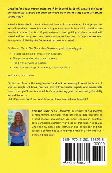 Looking for a fast way to learn tarot? "60 Second Tarot" will explain the cards so simply that anyone can read the entire deck within sixty seconds! Sound impossible? Not with these simple tools that break down symbols into pieces of a larger puzzle. You will be able to remember a meaning for every card in the deck in less than one minute. Anmarie Uber is a 32 year veteran of tarot guiding students to read with speed and accuracy for over 17 years in tarot workshops. And now she is sharing her life's work to help you take over this system of divining the future and become its master! She welcomes you to test her one minute method. In the book: predict the timing of events with accuracy and amaze your clients. with simple tools so you are never stuck on the meaning of a card. read with or without intuition to build your confidence. interpret your own readings without fear & gain control of your future choices. learn to decode the meanings of numbers, colors, symbols, and much, much more. 60 Second Tarot is the easy-to-use handbook for learning to read the future. If you like simple solutions, practical advice from trusted experts and measurable results then you'll love Anmarie Uber's empowering guide to harnessing the ability to read like a pro. ¿¿¿¿¿"I have managed a new age store for over 20 years and have never seen tarot presented in such a simple language. Anmarie's class inspired me to start giving readings professionally after years of struggling with mastering the cards. An added bonus, her method will work for those using intuition or those who believe they don't have it! I have continued to recommend her books and class as premium material and a must." "Thanks to Anmarie's class I have a much better understanding of the cards. I no longer have to refer to a booklet or notes to know the meaning of every card. Now I have tools to remember the meanings by memory. I would highly recommend her class." "The class (Tarot 101) was a blast and helpful! Her books, just as good!"