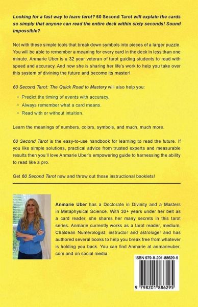 Looking for a fast way to learn tarot? "60 Second Tarot" will explain the cards so simply that anyone can read the entire deck within sixty seconds! Sound impossible? Not with these simple tools that break down symbols into pieces of a larger puzzle. You will be able to remember a meaning for every card in the deck in less than one minute. Anmarie Uber is a 32 year veteran of tarot guiding students to read with speed and accuracy. And now she is sharing her life's work to help you take over this system of divining the future and become its master! 60 Second Tarot: The Quick Road to Mastery will also help you:Predict the timing of events with accuracy. Always remember what a card means. Read with or without intuition. Learn the meanings of numbers, colors, symbols, and much, much more. 60 Second Tarot is the easy-to-use handbook for learning to read the future. If you like simple solutions, practical advice from trusted experts and measurable results then you'll love Anmarie Uber's empowering guide to harnessing the ability to read like a pro. Get "60 Second Tarot" now and throw out those instructional booklets!