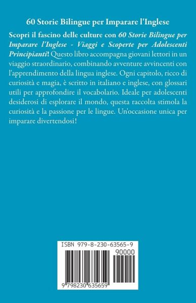 Scopri il fascino delle culture con 60 Storie Bilingue per Imparare l'Inglese - Viaggi e Scoperte per Adolescenti Principianti! Questo libro accompagna giovani lettori in un viaggio straordinario, combinando avventure avvincenti con l'apprendimento della lingua inglese. Ogni capitolo, ricco di curiosità e magia, è scritto in italiano e inglese, con glossari utili per approfondire il vocabolario. Ideale per adolescenti desiderosi di esplorare il mondo, questa raccolta stimola la curiosità e la passione per le lingue. Un'occasione unica per imparare divertendosi!