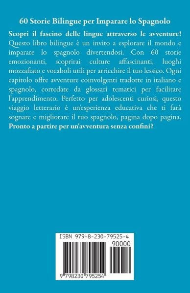 Scopri il fascino delle lingue attraverso le avventure! Questo libro bilingue è un invito a esplorare il mondo e imparare lo spagnolo divertendosi. Con 60 storie emozionanti, scoprirai culture affascinanti, luoghi mozzafiato e vocaboli utili per arricchire il tuo lessico. Ogni capitolo offre avventure coinvolgenti tradotte in italiano e spagnolo, corredate da glossari tematici per facilitare l'apprendimento. Perfetto per adolescenti curiosi, questo viaggio letterario è un'esperienza educativa che ti farà sognare e migliorare il tuo spagnolo, pagina dopo pagina. Pronto a partire per un'avventura senza confini?