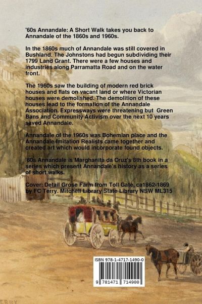 '60s Annandale: A Short Walk takes you back to Annandale of the 1860s and 1960s. In the 1860s much of Annandale was still covered in Bushland. The Johnstons had begun subdividing their 1799 Land Grant. There were a few houses and industries along Parramatta Road and on the water front. The 1960s saw the building of modern red brick houses and flats on vacant land or where Victorian houses were demolished. The demolition of these houses lead to the formation of the Annandale Association. Expressways were threatening but Green Bans and Community Activism over the next 10 years saved Annandale. Annandale of the 1960s was Bohemian place and the Annandale Imitation Realists came together and created art which would incorporate found objects. '60s Annandale is Marghanita da Cruz's 8th book in a series which present Annandale's history as a series of short walks. Cover: Detail Grose Farm from Toll Gate, ca1862-1869 by FC Terry. Mitchell Library State Library NSW ML315