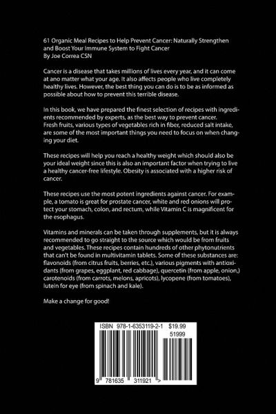 61 Organic Meal Recipes to Help Prevent Cancer: Naturally Strengthen and Boost Your Immune System to Fight Cancer By Joe Correa CSN Cancer is a disease that takes millions of lives every year, and it can come at ano matter what your age. It also affects people who live completely healthy lives. However, the best thing you can do is to be as informed as possible about how to prevent this terrible disease. Studies show that 33% of all types of cancer can be prevented with a healthy lifestyle. But, this is primarily related to healthy eating and physical activity. In this book, we have prepared the finest selection of recipes with ingredients recommended by experts, as the best way to prevent cancer. Fresh fruits, various types of vegetables rich in fiber, reduced salt intake, are some of the most important things you need to focus on when changing your diet. These recipes will help you reach a healthy weight which should also be your ideal weight since this is also an important factor when trying to live a healthy cancer-free lifestyle. Obesity is associated with a higher risk of cancer. Quitting or reducing alcohol consumption and quit smoking will help your immune system to be stronger so that it can fight any disease. These recipes use the most potent ingredients against cancer. For example, a tomato is great for prostate cancer, white and red onions will protect your stomach, colon, and rectum, while Vitamin C is magnificent for the esophagus. Vitamins and minerals can be taken through supplements, but it is always recommended to go straight to the source which would be from fruits and vegetables. These recipes contain hundreds of other phytonutrients that can't be found in multivitamin tablets. Some of these substances are: flavonoids (from citrus fruits, berries, etc.), various pigments with antioxidants (from grapes, eggplant, red cabbage), quercetin (from apple, onion,) carotenoids (from carrots, melons, apricots), lycopene (from tomatoes), lutein for eye (from spinach and kale). Make a change for good!