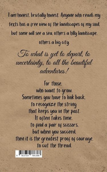 For those, who want to grow. Sometimes you have to look back, to recognize the string that keeps you in the past. It often takes time, to find a pair of scissors, but when you succeed, then it is the greatest proof of courage, to cut the thread. Philosophical and poetic encounters with myself and life.