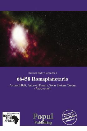 Please note that the content of this book primarily consists of articles available from Wikipedia or other free sources online. 66458 Romaplanetario is a main-belt asteroid. The asteroid belt is the region of the Solar System located roughly between the orbits of the planets Mars and Jupiter. It is occupied by numerous irregularly shaped bodies called asteroids or minor planets. The asteroid belt is also termed the main asteroid belt or main belt because there are other asteroids in the Solar System such as near-Earth asteroids and trojan asteroids. Maybe half the mass of the belt is contained in the four largest asteroids: 1 Ceres, 4 Vesta, 2 Pallas, and 10 Hygiea. These have mean diameters of more than 400 km, while Ceres, the asteroid belt's only identified dwarf planet, is about 950 km in diameter.