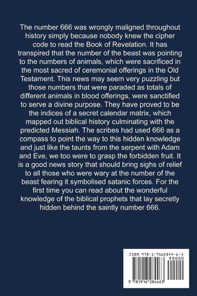 The number 666 was wrongly maligned throughout history simply because nobody knew the cipher code to read the Book of Revelation. It has transpired that the number of the beast was pointing to the numbers of animals, which were sacrificed in the most sacred ceremonial offerings in the Old Testament. Those numbers that were paraded as totals of different animals in blood offerings have proved to be the indices of a secret calendar matrix, which mapped out biblical history culminating with the predicted Messiah. The scribes had used 666 as a compass to point the way to this hidden knowledge and just like the taunts from the serpent with Adam and Eve, we too were to grasp the forbidden fruit. It is a good news story that should bring sighs of relief to all those who were wary of the number of the beast fearing it symbolised satanic forces. The findings give us an insight into the brilliant cognitive minds of the biblical prophets and see how they used a magnificent calendar matrix to plot out the future. And the number 666 was an integral part of that complex calendar of the gods.