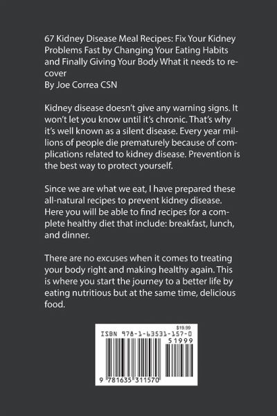 67 Kidney Disease Meal Recipes: Fix Your Kidney Problems Fast by Changing Your Eating Habits and Finally Giving Your Body What it needs to recover By Joe Correa CSN Kidney disease doesn’t give warning signs. It won’t let you know until it’s chronic. That’s why it’s well known as a silent illness. Every year millions of people die prematurely because of complications related to kidney disease. Prevention is the best way to protect yourself. Since we are what we eat, I have prepared these recipes for you including natural products to prevent kidney disease. Here you will be able to find recipes for a complete healthy diet including breakfast, lunch, and dinner. There are no more excuses to start treating your body the way it was meant to be treated. This is where you start the journey for a healthy life through delicious food.
