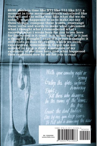 68/88 or should I call it 68/88/2008 this is in essence the same text as chocolate chips & soup a previous volume in this series. I suppose I could have just reprinted it as it was is. But it was 50%%%% or more of what I did before. So I followed my editor's (Pati Bubach) advice and blew it out. Rewrote it. Reused the words. Like refrigerator magnet poetry. Or taking what was and cutting it up into little pieces and tossing them I Ching like or like drawing straws or picking numbers out of a hat. Well I revised rewrote redid the work. It seems to have come out almost like a novel instead of poetry. But it retranslates and re-imagines what was and what is and how I saw the world long ago and reinterpreted to how I see it today with few caveats to what I now and you may view as my sophomoric naivete. But to me and my editor it was a sea change.