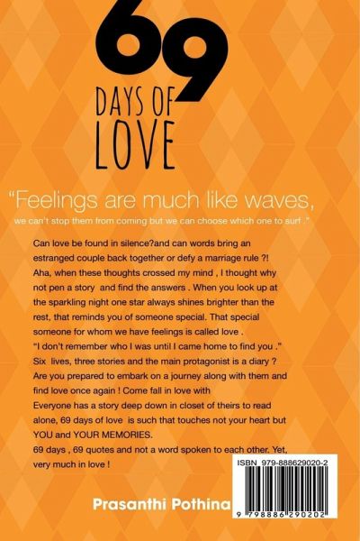 ""Feelings are much like waves, we cant stop them from coming, but we can choose which one to surf."" Can love be found in silence? and can words bring an estranged couple back together or defy a marriage rule?! Aha, when these thoughts crossedmy mind, i thought why not pen a story and find the answers. when you look up bat the sparkling night, one star always shines brighter than the rest, that reminds you of someone special. That special someone for whom we have feelings is called LOVE. ""I don't remember who i was until i came home to find you."" Six live, three stories and the maihn protagonist is a diary? are you prepared to embark on a journey along with them and find love once again! Come fall in love. everyone has a story deep down in closet of theirs to read alone, 69 days of love is such that touches not your heart but YOU and YOUR MEMORIES. 69 days, 69 quotes and not a word spoken to each other. Yet, very much in love.