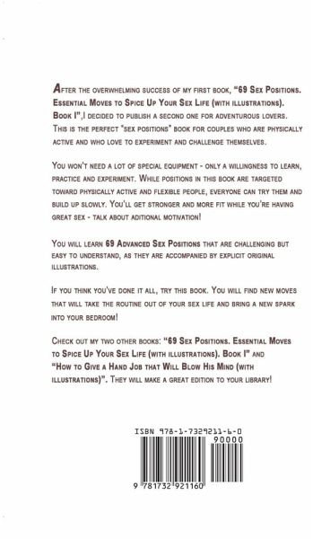 After the overwhelming success of my first book, "69 Sex Positions. Essential Moves to Spice Up Your Sex Life (with illustrations). Book I", I decided to publish a second one for adventurous lovers. This is the perfect "sex positions" book for couples who are physically active and who love to experiment and challenge themselves.You won't need a lot of special equipment - only a willingness to learn, practice and experiment. While positions in this book are targeted toward physically active and flexible people, everyone can try them and build up slowly. You'll get stronger and fitter while you're having great sex - talk about additional motivation!You will learn 69 advanced sex positions that are challenging but easy to understand, as they are accompanied by explicit original illustrations.These sex positions are divided into the following categories:Lying-Down Positions. Sitting Positions. Standing Positions. Kneeling Positions. If you think you've done it all, try this book. You will find new moves that will take the routine out of your sex life and bring a new spark into your bedroom!Want to learn more to experience mind-blowing, satisfying sex?Just scroll to the top of the page and click the "Buy Now" button!