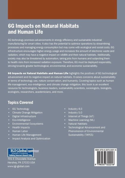 "This book gives perspective about the effects of technological development on the natural habitats as well as the effect on the human life. It will cover the generation of networks pros and cons, effects of 6G on natural habitat, IoT with 6G in the Context of Industry 4.0, comparative study of 6G Wireless Communication Networks, scope and future trends in 6G, and the impact of 6G Technologies on Industry 5.0"-- Provided by publisher.
