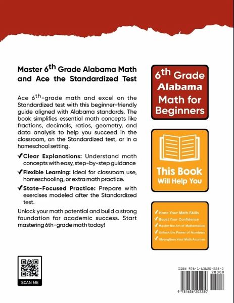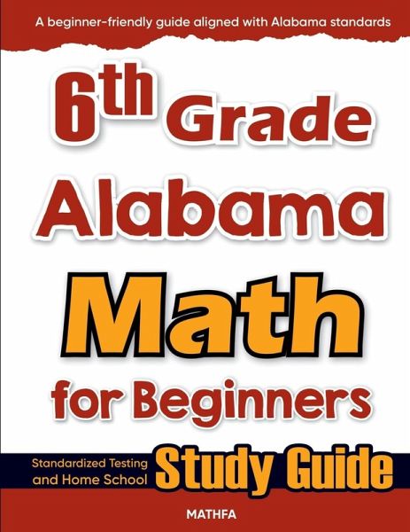 6th Grade Alabama Math Comprehensive & Aligned with Alabama Standardized Test Help your child thrive in 6th Grade ACAP Math with this thoughtfully designed and easy-to-understand workbook. Created to match Alabama's academic standards, this resource breaks down key math concepts-like integers, fractions, decimals, ratios, algebra, geometry, statistics, and probability-into simple, manageable lessons that build confidence and prepare students for the ACAP assessment. ¿ Made for every learner - Whether your child is just starting or ready for a challenge, the lessons adapt to all skill levels. ¿ Math that makes sense - Real-world examples show how math applies outside the classroom, making each concept more meaningful. ¿ Focused on Alabama standards - Everything in this book is built to support success on the ACAP and in school. ¿ Practice that sticks - Includes tons of exercises and review pages to help students truly master what they've learned. ¿ Flexible for busy families - Use it in the classroom, during homeschooling, or for extra support after school. Published by Mathfa - your partner in building strong math skills for life.