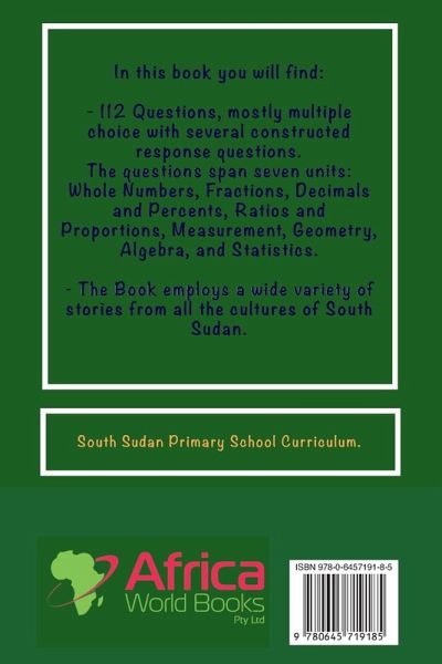In this book, you will find 112 Questions, mostly multiple-choice, with several constructed response questions. The questions span seven units: Whole Numbers, Fractions, Decimals and percents, ratios and proportions, Measurement, Geometry, Algebra, and Statistics. The Book employs a wide variety of stories from all the cultures of South Sudan. South Sudan Primary School Curriculum.