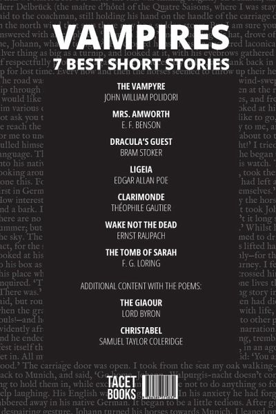 7 Best Short Stories - Vampires is a fascinating collection of stories that explores the mythical figure of the vampire in various facets, combining horror, suspense, and romance. Each story in this selection immerses the reader in dark and atmospheric narratives, where the supernatural intertwines with the psychological, creating characters and situations that challenge the boundary between fear and desire. Complementing the stories, the collection includes the poems The Giaour, by Lord Byron, and Christabel, by Samuel Taylor Coleridge, both rich in melancholic and supernatural atmospheres, exploring the seduction and terror associated with vampires. This book contains the following stories: The Vampyre - John William Polidori - Aubrey, a young Englishman, travels across Europe with the mysterious Lord Ruthven, only to discover his true nature as a vampire. This story is a landmark in vampire literature, defining many of the elements that would shape the genre. Mrs. Amworth - E. F. Benson - The arrival of Mrs. Amworth in a quiet village raises suspicions, especially when disturbing events begin to occur. Is she a supernatural threat? This story explores the dangers hidden behind a friendly facade. Dracula's Guest - Bram Stoker - An English traveler ignores warnings and faces supernatural events during Walpurgis Night near Munich. This story serves as an atmospheric prologue to the classic Dracula. Ligeia - Edgar Allan Poe - A man recalls his obsession with Ligeia, a woman of extraordinary beauty and intellect, as love and death intertwine in a poetic and dark narrative. Clarimonde - Théophile Gautier - The young priest Romuald is seduced by the courtesan Clarimonde, who drags him into a world where desire and spiritual damnation merge. A tale of lust and spiritual conflict. Wake not the Dead - Ernst Raupach - Walter brings his deceased wife back to life, but soon discovers the terrifying consequences of defying the forces beyond. This story delves into the horror of obsessive