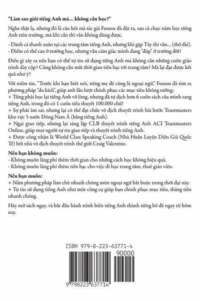 "Làm sao gi¿i ti¿ng Anh mà... không c¿n h¿c?" Nghe th¿t l¿, nh¿ng ¿ó là câu h¿i mà tác gi¿ Fususu ¿ã ¿¿t ra, sau c¿ ch¿c n¿m h¿c ti¿ng Anh trên tr¿¿ng, mà khi c¿n thì v¿n không dùng ¿¿¿c: - Ph¿i h¿c c¿ ngàn t¿ m¿i trên tr¿¿ng, nh¿ng khi g¿p l¿i v¿n c¿n tra t¿ ¿i¿n. - Ph¿i thüc c¿ tr¿m c¿u trúc ng¿ pháp, nh¿ng vi¿t xong m¿t câu v¿n t¿ h¿i, "Li¿u có sai không?" - Dành c¿ thanh xuân t¿i các trung tâm ti¿ng Anh, nh¿ng khi g¿p Tây thì v¿n... (th¿ dài). - ¿i¿m có th¿ cao ¿ tr¿¿ng h¿c, nh¿ng v¿n c¿m giác mình ¿ang "¿úp" ¿ tr¿¿ng ¿¿i! ¿i¿u gì x¿y ra n¿u b¿n có th¿ t¿ tin s¿ d¿ng ti¿ng Anh mà không c¿n nh¿ng cün giáo trình dày c¿p? C¿ng không c¿n m¿t th¿i gian ti¿n b¿c t¿i trung tâm? Mà l¿i ¿¿t ¿¿¿c k¿t qü nh¿ ý? V¿i ni¿m tin, "Tr¿¿c khi b¿n bi¿t nói, ti¿ng m¿ ¿¿ c¿ng là ngöi ng¿," Fususu ¿ã tìm ra ph¿¿ng pháp "du kích", giúp anh l¿n l¿¿t chinh ph¿c các m¿c tiêu không t¿¿ng: + T¿ng ph¿i h¿c l¿i ti¿ng Anh v¿ lòng, nh¿ng ¿ã t¿ d¿ch h¿n 6 cün sách c¿a mình sang ti¿ng Anh, trong ¿ó có 1 cün ti¿u thuy¿t 100.000 ch¿! + S¿ phát âm sai, nh¿ng l¿i có th¿ ¿¿t ch¿c vô ¿¿ch thuy¿t trình hài h¿¿c Toastmasters khu v¿c 5 n¿¿c ¿ông Nam Á (b¿ng ti¿ng Anh). + Ng¿i giao ti¿p, nh¿ng l¿i sáng l¿p CLB thuy¿t trình ti¿ng Anh ACI Toastmasters Online, giúp m¿i ng¿¿i t¿ tin giao ti¿p và thuy¿t trình ti¿ng Anh. + ¿¿¿c công nh¿n là World Class Speaking Coach (Nhà Hün Luy¿n Di¿n Gi¿ Qüc T¿) b¿i nhà vô ¿¿ch thuy¿t trình th¿ gi¿i Craig Valentine. T¿ 2017, Fususu ¿ã b¿t ¿¿u t¿p h¿p các bí quy¿t h¿c ti¿ng Anh hi¿u qü, và cho ra ¿¿i cün sách song ng¿ ¿¿c ¿áo "21 Cách H¿c Ti¿ng Anh Du Kích". Sau ¿ó, sách ¿ã l¿t top bán ch¿y, giúp ích cho hàng ngàn ¿¿c gi¿: * Tránh nh¿ng sai l¿m ch¿t ng¿¿i khi¿n cho vi¿c h¿c ti¿ng Anh ngày càng kh¿, mà không hi¿u qü. * N¿m ¿¿¿c b¿n ch¿t c¿a cách h¿c ngöi ng¿ "thün theo t¿ nhiên". * S¿ h¿u t¿i 21 công c¿ giúp b¿n làm ch¿ ti¿ng Anh m¿i lúc m¿i n¿i (k¿ c¿ khi ng¿). * ¿¿c bi¿t các nguyên lý và bí quy¿t trong sách có th¿ áp d¿ng cho m¿i ngöi ng¿. Hi¿n t¿i, sách l¿i ¿¿¿c tái b¿n, c¿p nh¿t m¿i các công c¿ m¿nh m¿, kèm thêm quà t¿ng khóa h¿c ¿¿c bi¿t cüi sách giúp b¿n làm ch¿ ti¿ng Anh k¿ c¿ khi m¿t g¿c. N¿u b¿n không mün: - Không mün lãng phí thêm th¿i gian cho nh¿ng cách h¿c không hi¿u qü. - Không mün lãng phí thêm ti¿n b¿c cho vi¿c ¿i h¿c trung tâm, thuê giáo viên. N¿u b¿n mün: + N¿m ph¿¿ng pháp làm ch¿ nhanh chóng món ngöi ng¿ b¿t büc trong th¿i ¿¿i này. + T¿ tin s¿ d¿ng ti¿ng Anh nh¿ m¿t công c¿ giúp b¿n chinh ph¿c m¿c tiêu, th¿ng ti¿n nhanh chóng. Hãy s¿ h¿u ngay m¿t cün 21 cách h¿c ti¿ng Anh du kích, và b¿t ¿¿u hành trình bi¿n ti¿ng Anh thành ti¿ng b¿ ¿¿ ngay t¿ hôm nay.