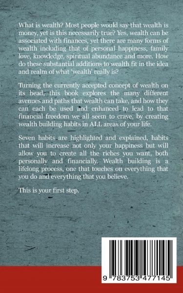 What is wealth? Most people would say that wealth is money, yet is this necessarily true? Yes, wealth can be associated with finances, yet there are many forms of wealth including that of personal happiness, family love, knowledge, spiritual abundance and more. How do these substantial additions to wealth fit in the idea and realm of what 'wealth' really is?Turning the currently accepted concept of wealth on its head, this book explores the many different avenues and paths that wealth can take, and how they can each be used and enhanced to lead to that financial freedom we all seem to crave, by creating wealth building habits in ALL areas of your life.Seven habits are highlighted and explained, habits that will increase not only your happiness but will allow you to create all the riches you want, both personally and financially. Wealth building is a lifelong process, one that touches on everything that you do and everything that you believe.This is your first step.