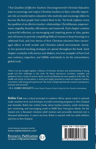 7 Key Qualities of Effective Teachers: Encouragement for Christian Educators aims to encourage and inspire Christian teachers in their critically important role as transformative educators who motivate and encourage others to become the best people God created them to be. The book explores seven key qualities of an effective teacher: relationships, Christlikeness, empowerment, empathy, humility, affirmation, and teamwork. Each chapter contains a prayerful reflection, an encouraging and inspiring poem or idea, quotes and references to provide compelling biblical reasons to keep focusing on a…mehr